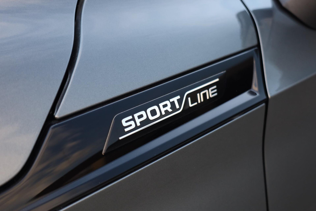 Keurige Skoda Kodiaq in de sportieve Sportline uitvoering. Extra benadrukt in de gave Graphite Grey metalliclak en voorzien van Crystal Face verlichte gril.